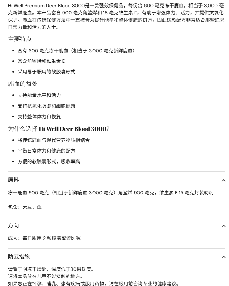Hi Well优质鹿血3000+角鲨烯和维生素E 500粒软胶囊 EXP.2028.05